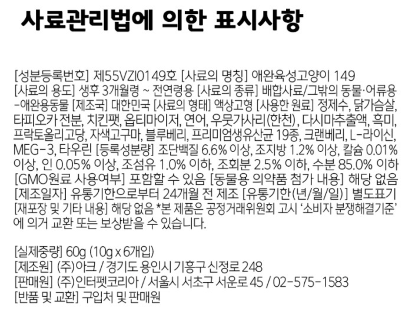 츄르에서 생선 향같은게 크게 느껴지진 않았는데 아래 영양성분을 보니 닭가슴살을 주 단백질 원료로 사용했다.