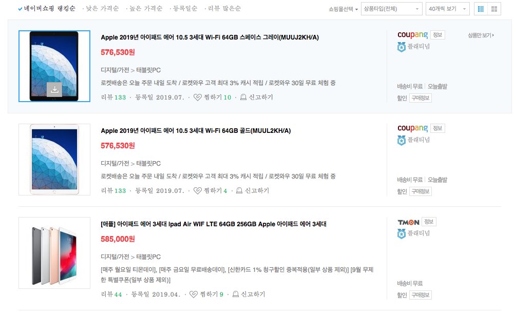이렇게 32기가는 최저가 약 38만원, 128기가는 최저가 약 50만원입니다. 그럼 에어 3세대는 어떨까요?
