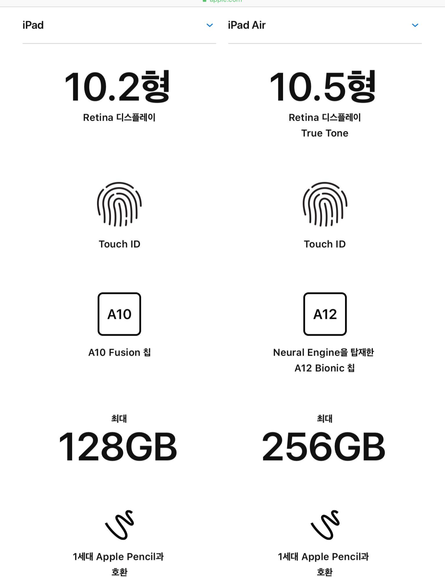 우선 애플 공식홈페이지에 보면 이렇게 두가지 제품을 비교할 수 있어요. 제가 생각했을 때 유의미한 비교데이터만 캡쳐해서 가져와봤습니다.