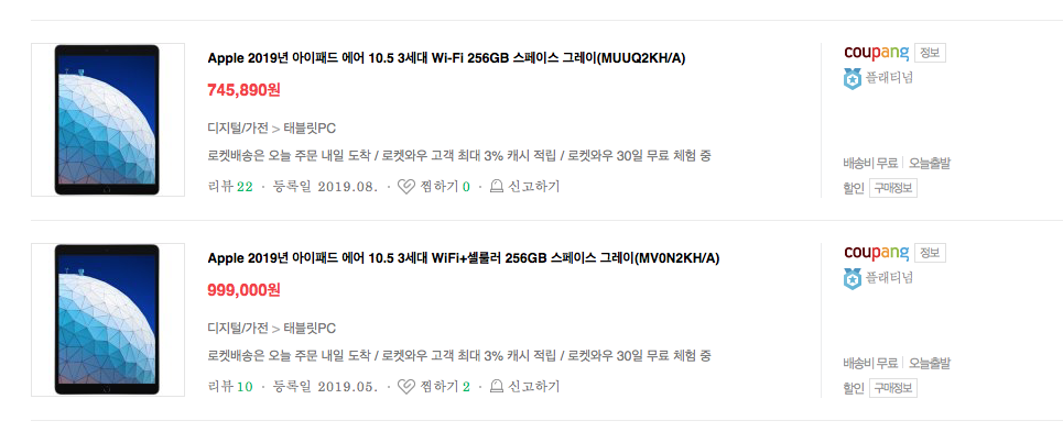 이렇게 32기가는 최저가 약 38만원, 128기가는 최저가 약 50만원입니다. 그럼 에어 3세대는 어떨까요?